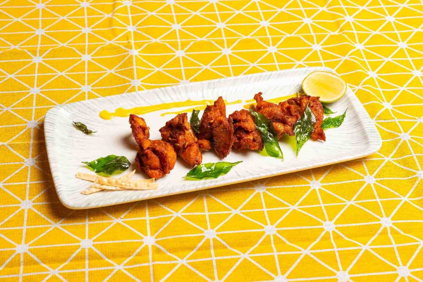 A fiery, flavorful South Indian appetizer made with boneless chicken marinated in a blend of spices, yogurt, and herbs.