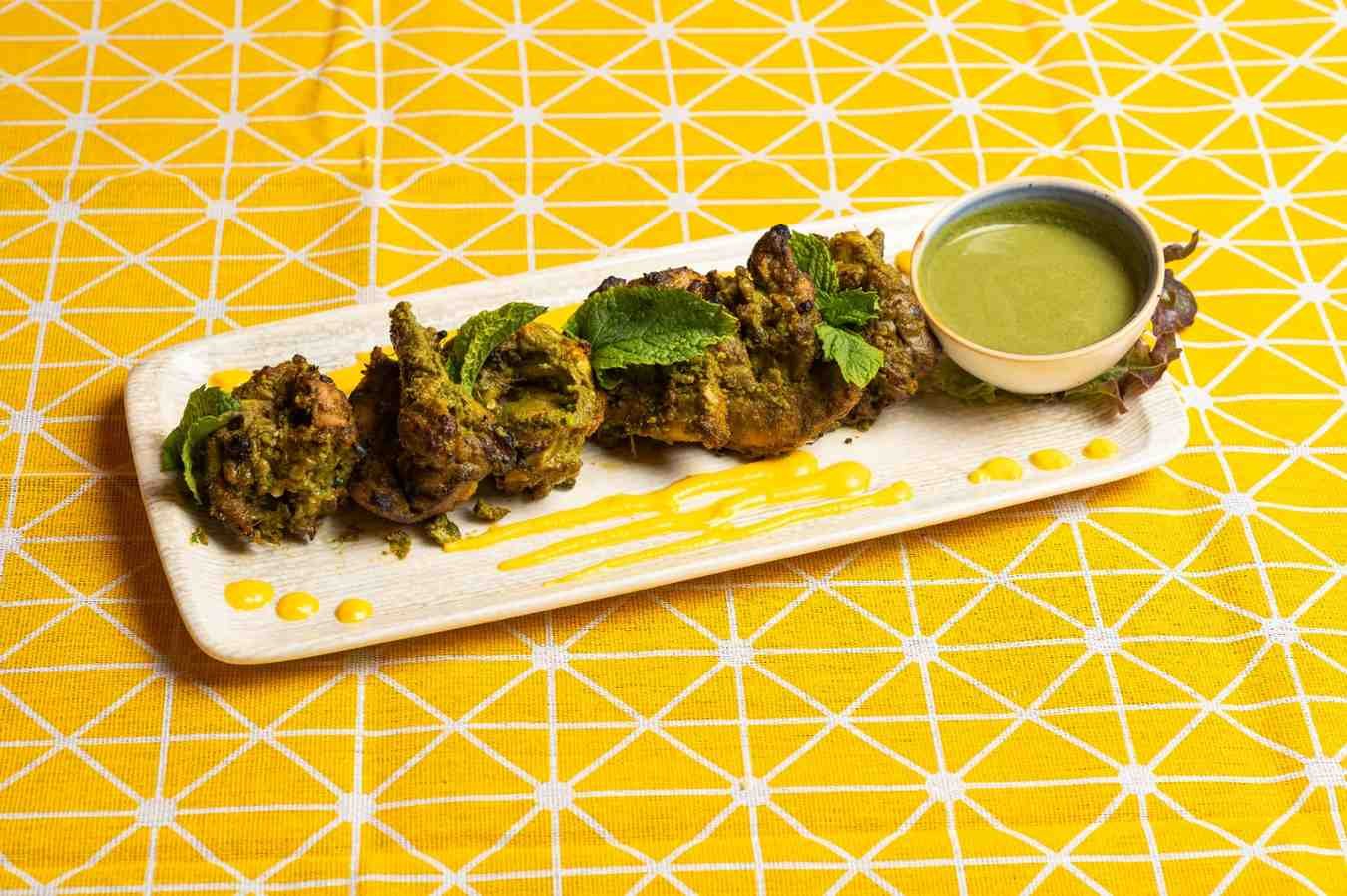 A flavorful North Indian grilled dish made with chicken marinated in a green herb blend of mint, coriander, spinach, yogurt, and spices, offering a smoky,